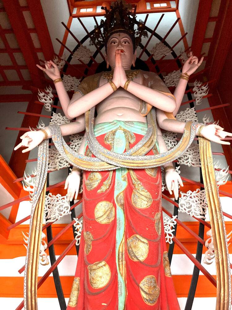On the west side stands a massive statue of Fukukenjaku Kannon, built after World War II — an awe-inspiring presence of compassion and strength.
