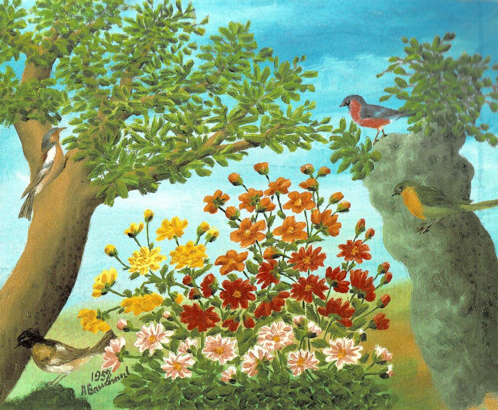 この《花と鳥》は、そんなボーシャンが85歳の最晩年に描いた作品。園芸の仕事をしていた彼らしく、草木や花、鳥といった自然のモチーフを得意としていて、この絵にもその魅力がぎゅっと詰まっています。シンプルでのびやかな筆致からは、自然を描くことを最後まで楽しんでいたボーシャンの姿が思い浮かびます。