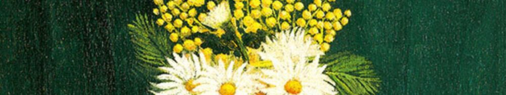描かれているのはマーガレットとミモザ。背景の緑とテーブルの赤がパッと目を引く強いコントラストになっていますが、グラスに挿された花々が画面全体を心地よくまとめています。よく見ると、マーガレットは全部こちらを向いていて、なんとも可愛らしい雰囲気。ルソーの人物画がいつも真正面なのを思い出させますね。まさに“ルソーらしい素朴さ”がにじみ出た作品です。