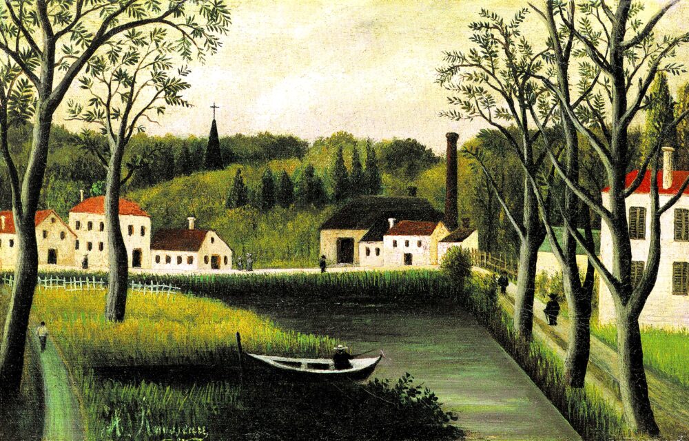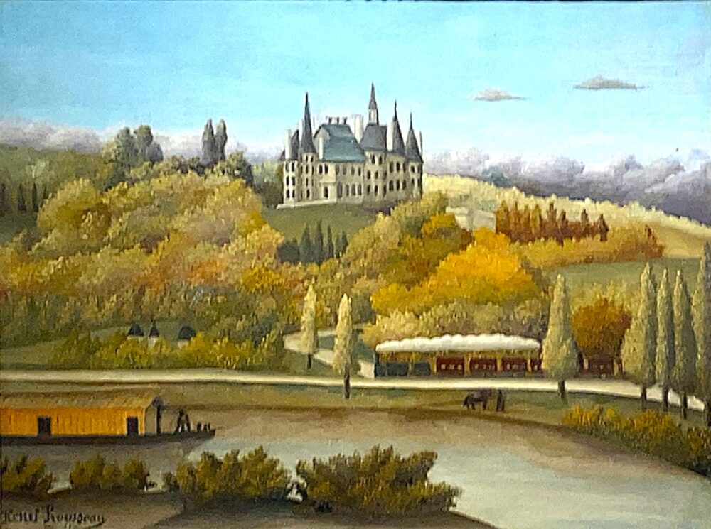遠景の木々は緑のグラデーションが美しく、フラットに描かれた家々の色面がぱっと目に入ります。草むらに作られたデコボコした柵や、遠くに小さく見える教会の尖塔など、細部にまでルソーらしさがあふれていますね。