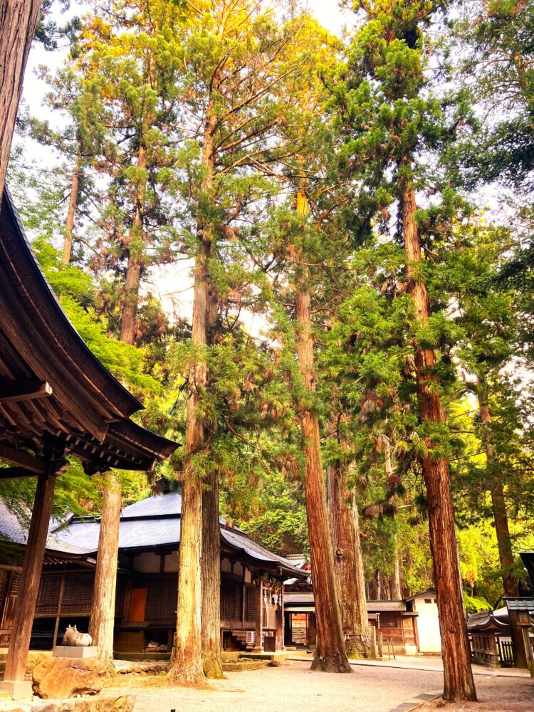 1141年創建という長い歴史を持つ神社で、拝殿前にそびえる杉の木はとにかく迫力満点。なかには樹齢1000年を超えるものもあり、その神秘的な雰囲気に思わず息をのんでしまいます。
