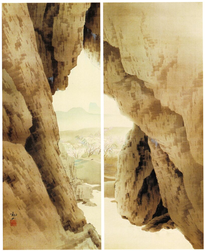 《武陵桃源》は、岩場の隙間から理想郷をのぞき見るように描かれた二幅一組の掛け軸作品。いつ描かれたかは正確にはわかっていませんが、掛軸を少し離して飾ってみてもまた違う表情を見せそうで、観山ならではのセンスを感じさせる一品です。